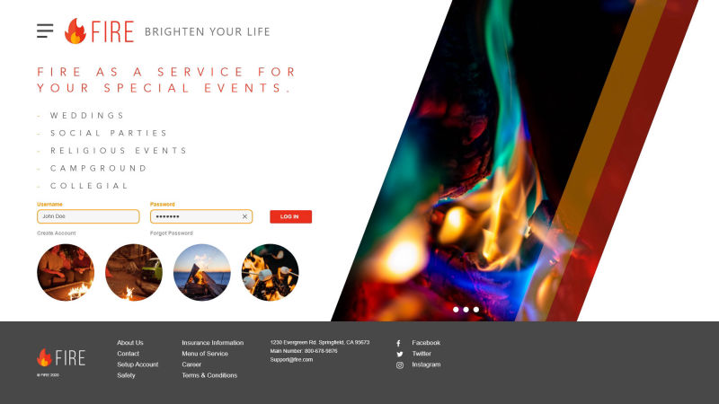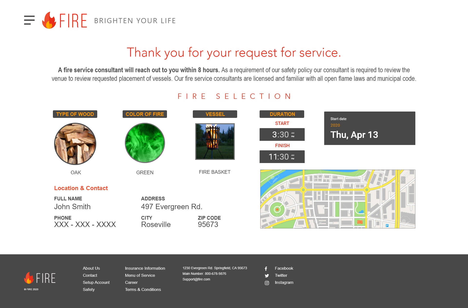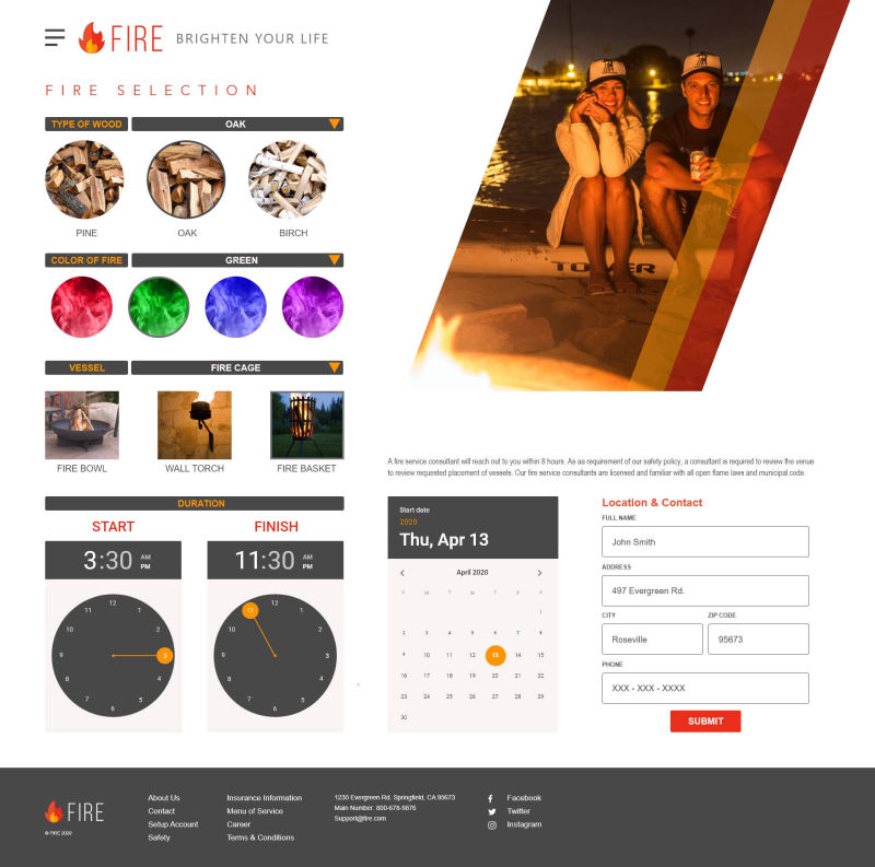 I originally thought of Fire as a Service because Fire is one of the most basic technologies and UX is all about people's experience with technology. Fire as a Service is being able to order Fire as an element for any special occasion and how people would go about that. These days you can't just start a fire and hope it goes well, there are experts in this field of entertainment. I wanted people to be able to order up for their special occasion or even companies that need this service regularly. i.e. campgrounds, country clubs, theme parks.
